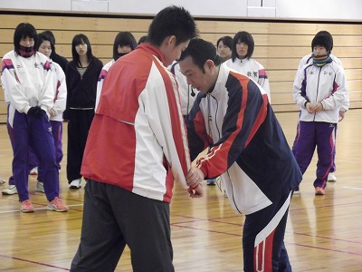 写真は、武術の技を体験してもらいながら